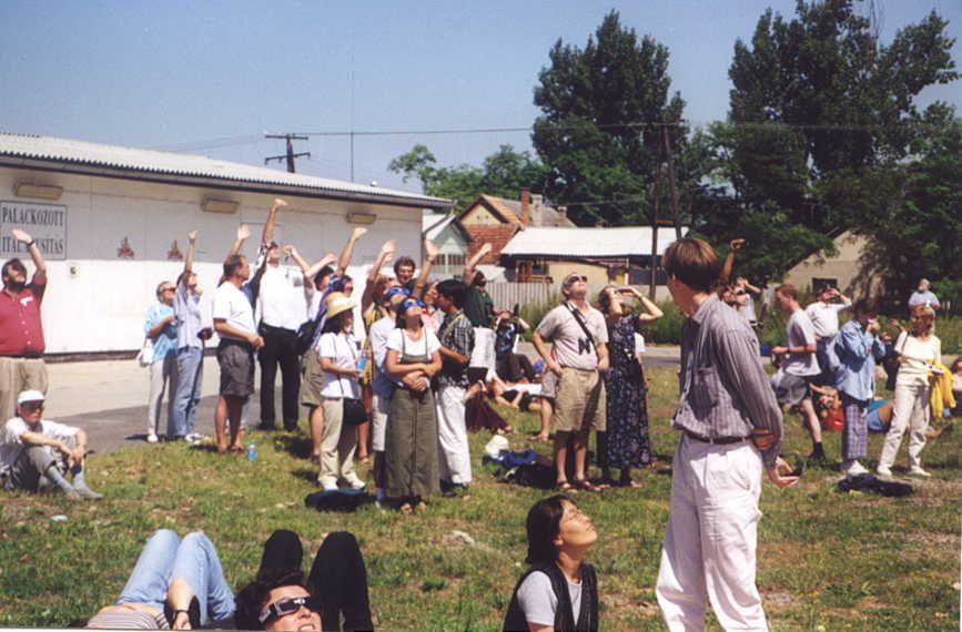 1) We had a serious scare the morning of the eclipse. As our motor-coaches were picking us up at our hotels, the sky was cloudy, and as we drove to the planned viewing site (which was to include a lunch of goulash and shows of the legendary Hungarian horsemanship), it only got worse. Our stalwart hosts stopped at a rest stop on the highway, got on the internet and pulled up a weather map, and discovered that the small clearing off to the west was big enough to try for. So we aborted lunch and drove off to the west chasing the hole in the clouds. After maybe half an hour, we were in the clear, and found a vacant lot to park in. We piled out of the coaches and set up shop (including a 12-inch "portable" telescope brought by a group of Danish graduate students -- thanks!). Here, we see lots of astronomers looking up a few minutes before totality began (still partial phase):
