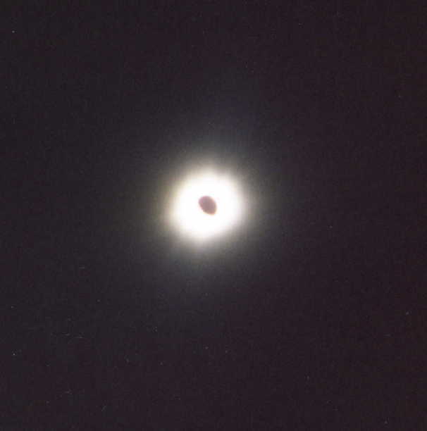 4) Totality. With only about five minutes of totality, I didn't want to waste much time messing with my camera. I decided to take one picture with my best guess of the aperture setting and exposure time (viva la manual camera!). I didn't get it exactly right: the corona is overexposed and the moon looks "washed out" rather than the profoundly black shadow I saw with my eyes. Ah well, its still my photo...