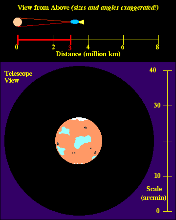 Your spacecraft is equipped with a telescope, and as you approach, you take a series of pictures of the planet. You take the first picture from a distance of 8 million km, and take another picture every 1 million km as you approach. The pictures are shown in the bottom panel of the movie, labeled "Telescope View".