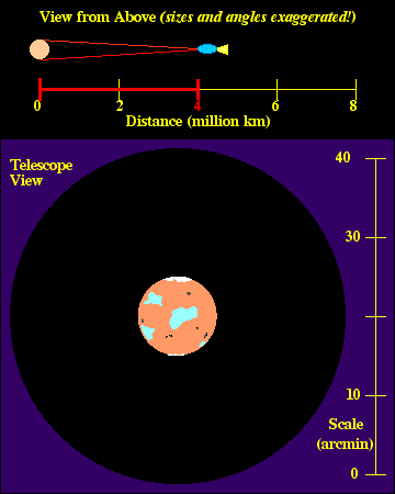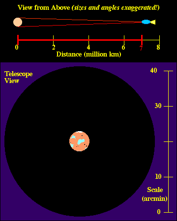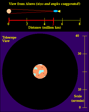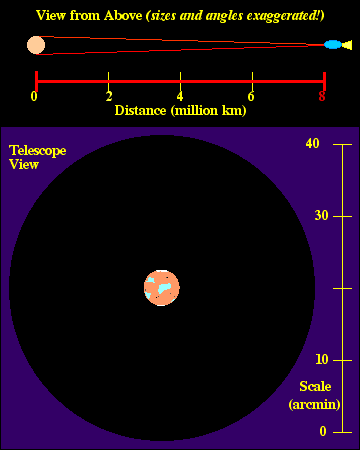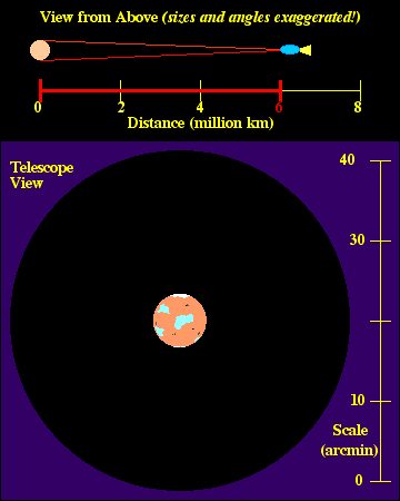 Watch the movie through several cycles (about 7 sec each), noticing the relationship between the distance between you and the planet at the angular size of the planet through the telescope. The red lines joining the front of your spacecraft with the edges of the planet in the top panel are another way of depicting the angular size of the planet.