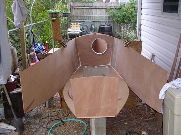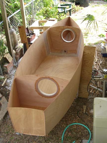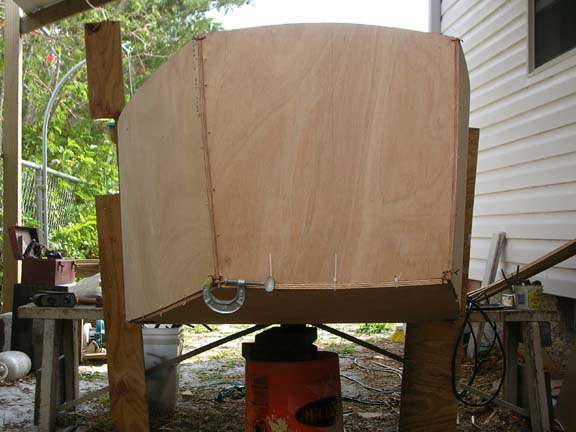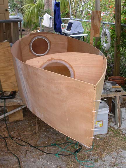 AllWiredUp01.jpg: And it looks like this. Here the chines have been wired together and everything adjusted & tightened up, and we are getting close to the final hull shape. Rocker and sheer curvature are determined by the pre-cut panels so no further support or temporary forms are needed.