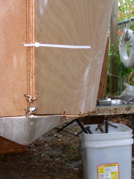 BowWiredUpDetail.jpg: Closeup of the temporary wire fastenings at bow & chine. I used 12-gauge copper wire left over from a house wiring project. Too heavy really, 16 ga would be fine if it was on hand. Tried some plastic wire ties in lightly loaded areas but don't like them, not as easy to tighten or adjust.
