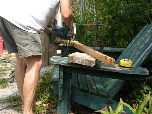 CuttingSheerBattens.jpg: Low tech shop. A short straightedge clamped to the circular saw's base and you can do as good a job as a table saw. These sheer battens are triangular in cross section to save weight and allow fiberglass to wrap over the inside easily.