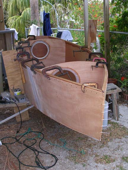 SheerBattensGoIn.jpg: Here they are installed with epoxy, a few clamps & lots of temporary screws. Sheer looks nice & fair now, and the hull is fairly rigid. After this I syringed a bead of thickened epoxy into the inside of the chines & other joints to lock everything solid. Once hard and sanded a little to knock down any blobs or splinters, I can go ahead with glass taping the chines and bulkheads. This installment has covered the most fun and fastest-paced part of the whole project. After this it is going to be a while before anything exciting happens, but the work that follows will be important for the boat's strength & longevity, so can't be rushed.