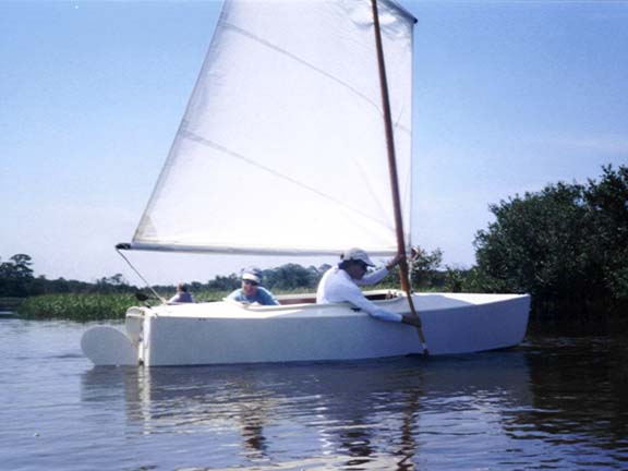 We took the boat to the Cedar Key small boat get-together May 7-8 for her trials. She's not finished yet by any means but is together enough for some tests to make sure everything is on track. Preliminary results in light airs and a couple hours in about 12 knot winds are very encouraging. Stability and sail carrying power are better than expected. She's unexpectedly dry, compared to her larger cousins which have had a tendency to spit spray from the weather chine in a chop (we were glad of that since the cockpit shelter is one of the things that isn't on yet). Speed is good upwind and down; she points well and tacks reliably.