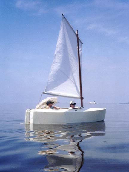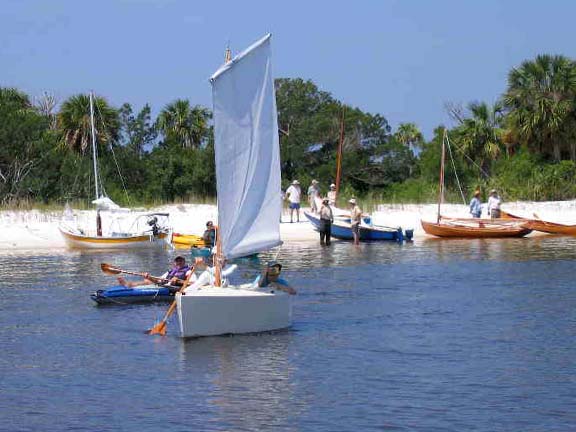Paddle-sailing past some of the other boats gathered for the weekend. Eventually I'll rig up a Yuloh (sculling oar), but the paddle does pretty well (photo courtesy of Glen Maxwell):
