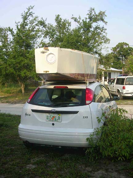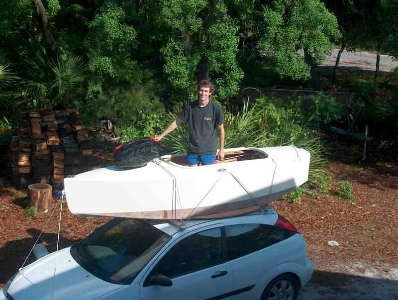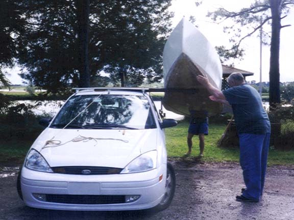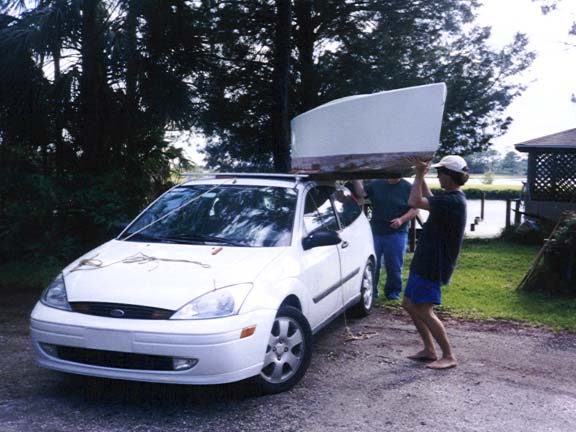 Loaded for travel. The empty boat weighs 130 lbs (well under the car's rated 220 lb roof load) and isn't difficult to load lifting one end at a time, using a temporary roof bar extension. Rig stows in the boat, portable ballast and loose gear low in the car for stability: