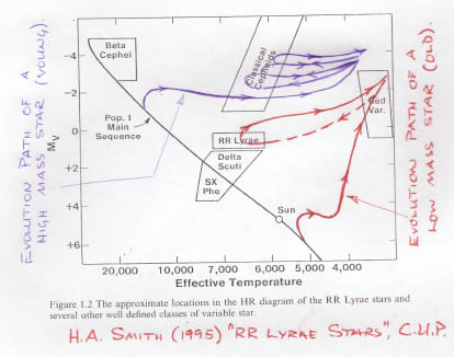 A Hertzprung-Russell diagram showing the absolute magnitude (MV) and surface temperature of RR Lyrae stars and Cepheids. The colored tracks are the evolutionary paths which lower and higher mass stars follow to arrive in the RRL and Cepheid instability regions, respectively.